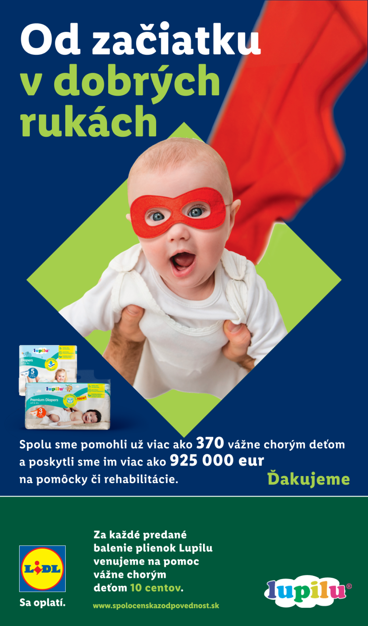 Ďakujeme, že aj vy pomáhate tým, ktorí to najviac potrebujú. V rámci projektu Od začiatku v dobrých rukách venujeme za každé predané balenie plienok značky Lupilu 10 centov na pomoc vážne chorým deťom vo veku do dovŕšených štyroch rokov. Každý týždeň takto podporíme jedno dieťa podľa jeho potrieb.